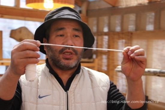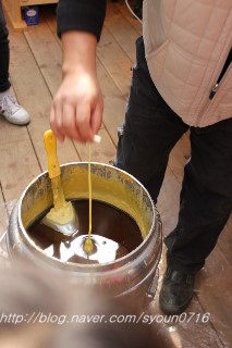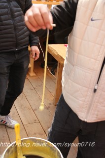 그다음 심지를 밀랍에 담궜다 빼기를 반복하여 초를 만든답니다.