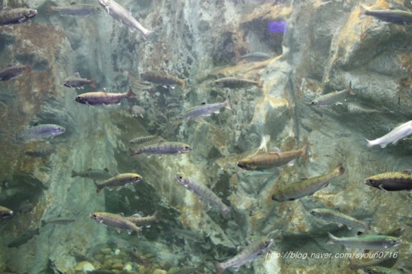 민물고기 생태관 입구에서 만난 무지개 송어와 산천어들...