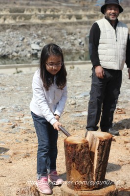 아빠랑 함께 장작패기에 도전하는 그녀....